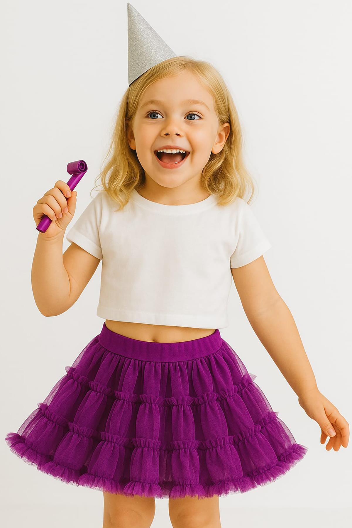 Mor renk kız çocuk kabarık tütü etek, küçük prensesiniz için mükemmel bir seçenektir. Bu zarif etek, dikkat çekici mor rengi ve kabarık tasarımı ile herhangi bir özel gün veya etkinlik için idealdir.